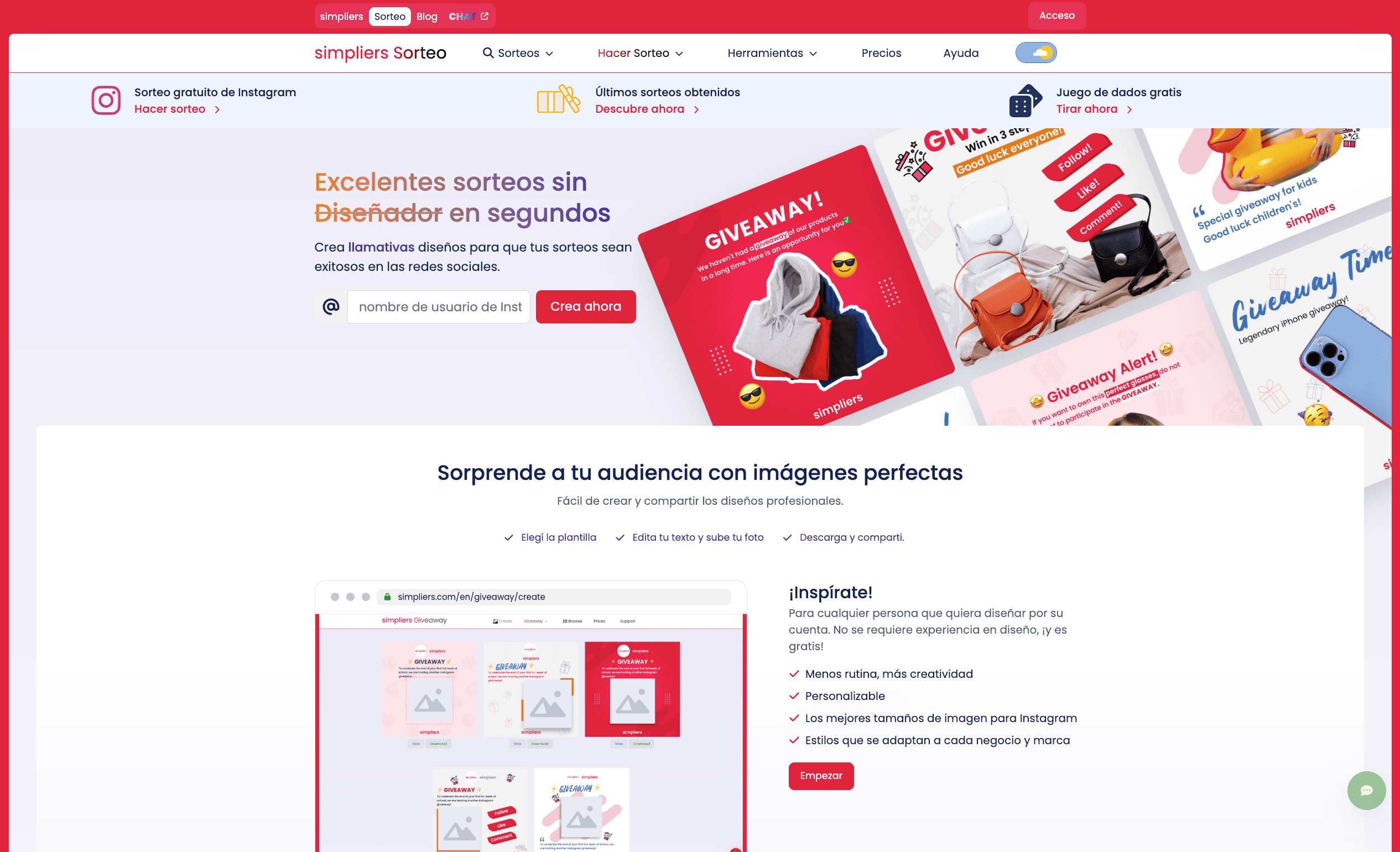 Después de elegir el premio correcto, compartilo públicamente en tu perfil de Instagram con una imagen atractiva. Podés usar herramientas de IA, plantillas de Canva para sorteos, o el generador de imágenes para sorteos de Simpliers para crear visuales profesionales rápidamente.